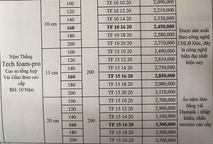 Nệm cao su tổng hợp  (Nệm cao su ép) Tech Foam – Pro được phân phối và được bảo hành 10 năm bởi: